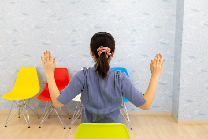 イスに座った状態で、背伸びをするイメージで両手を頭の上まで上げましょう。